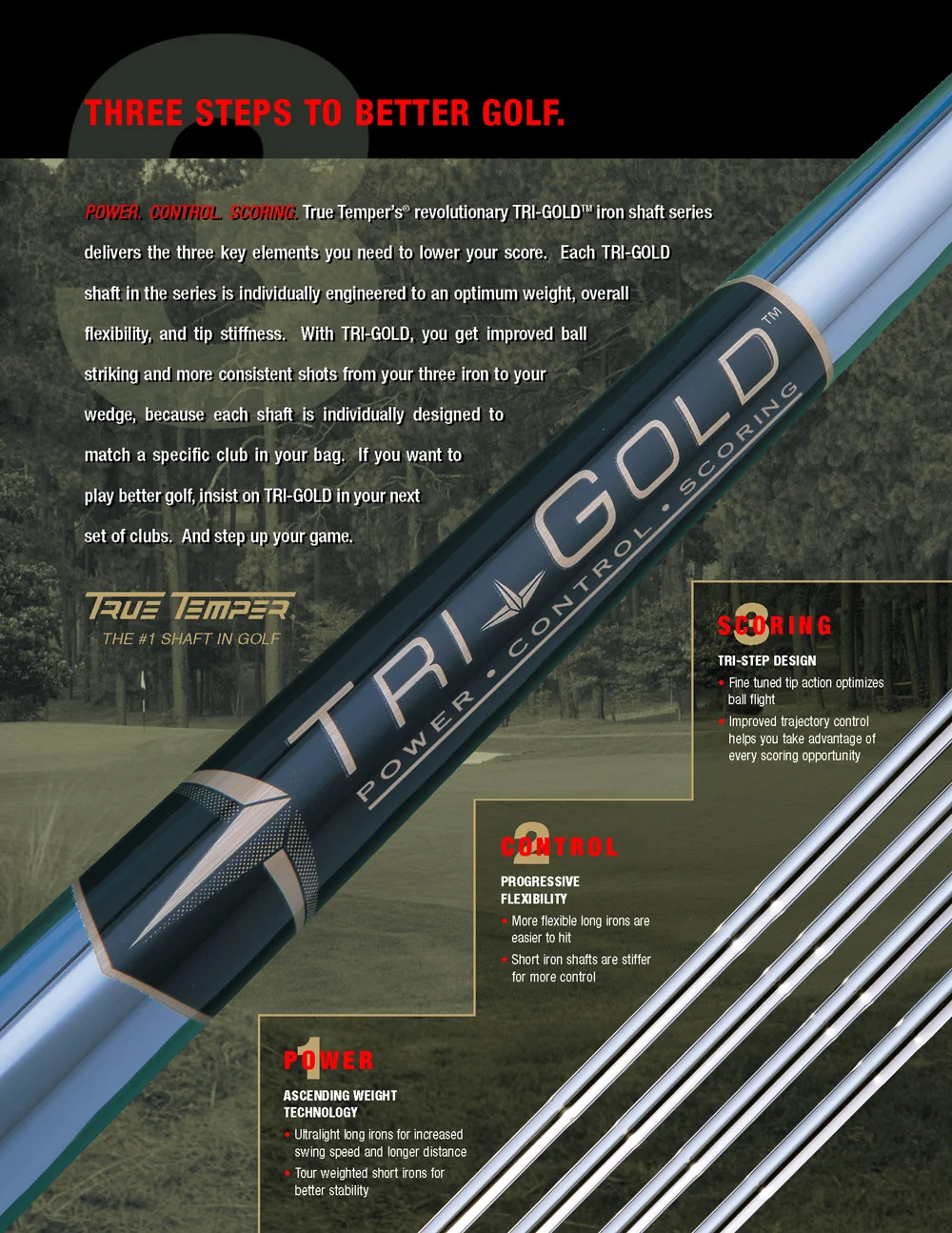 Magazine ad created to promote the features and benefits of True Temper’s Tri-Gold golf shafts.