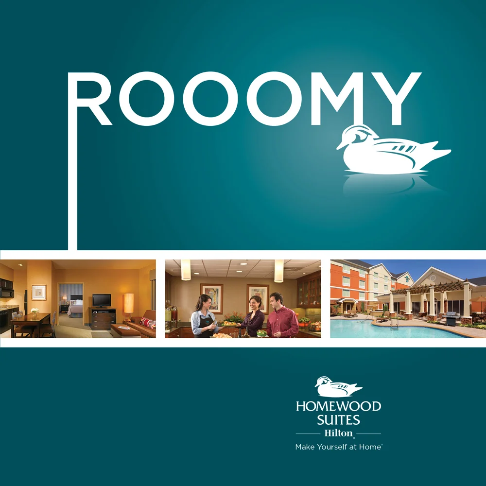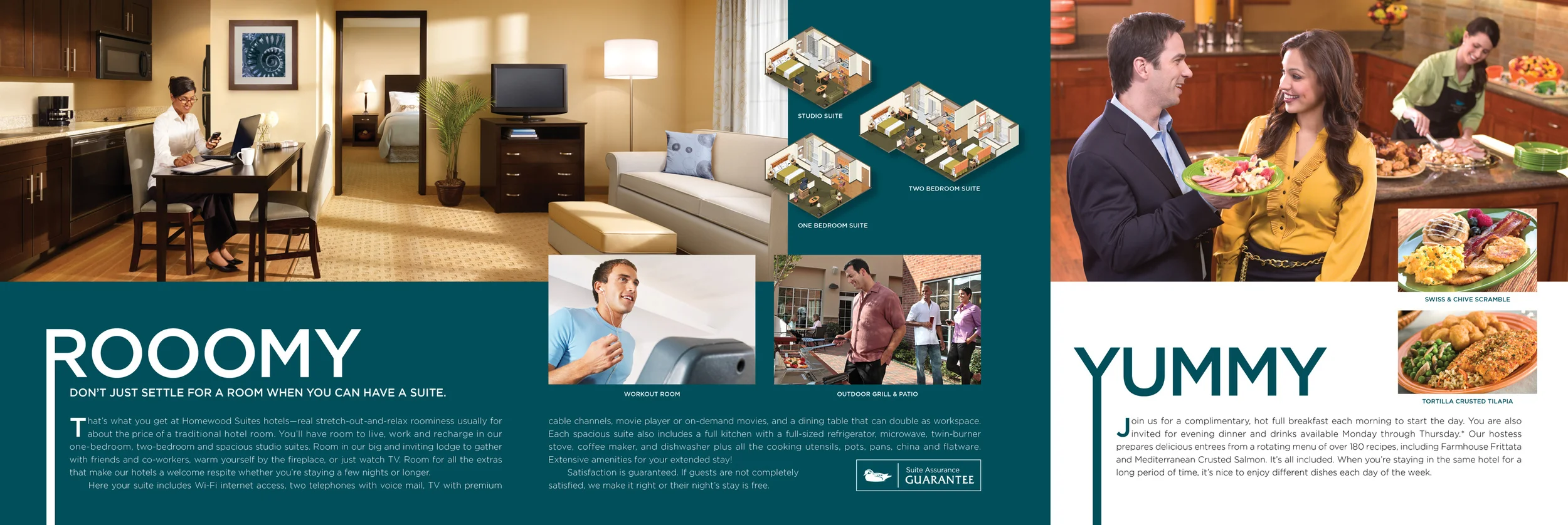 A brochure promoting the amenities and features of Homewood Suites hotels.