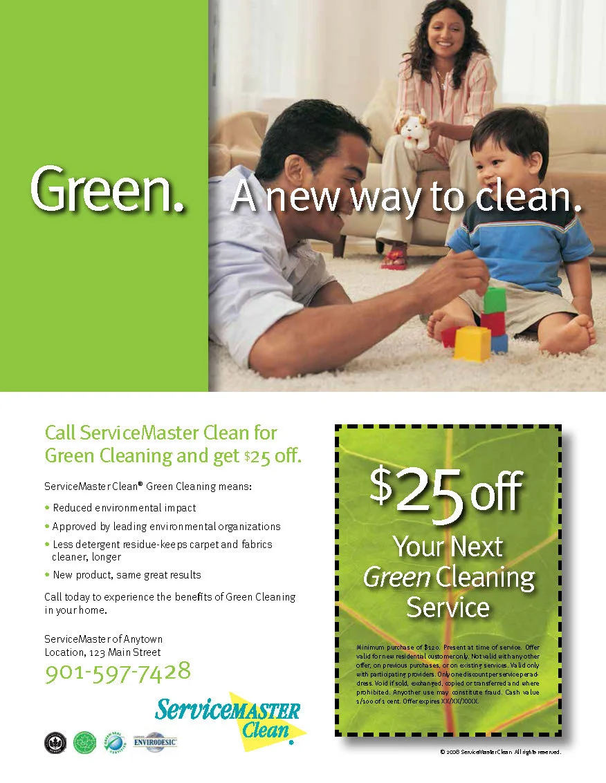 A sales sheet promoting ServiceMaster Clean’s “Green” cleaning process with a $25 off offer on your next cleaning service.
